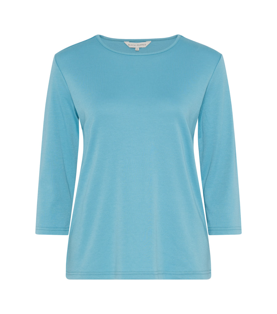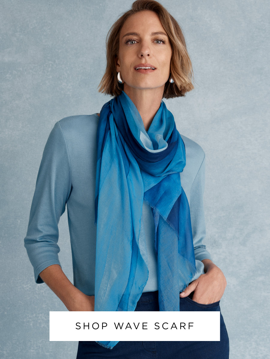 Complemented by Cornsilk blue and Erinite, the range is soft and calming. We think you will love the Shaya blouse in a bold, abstract print, an Essential Top in striking Erinite and a scarf in stunning teals and shades of blue.